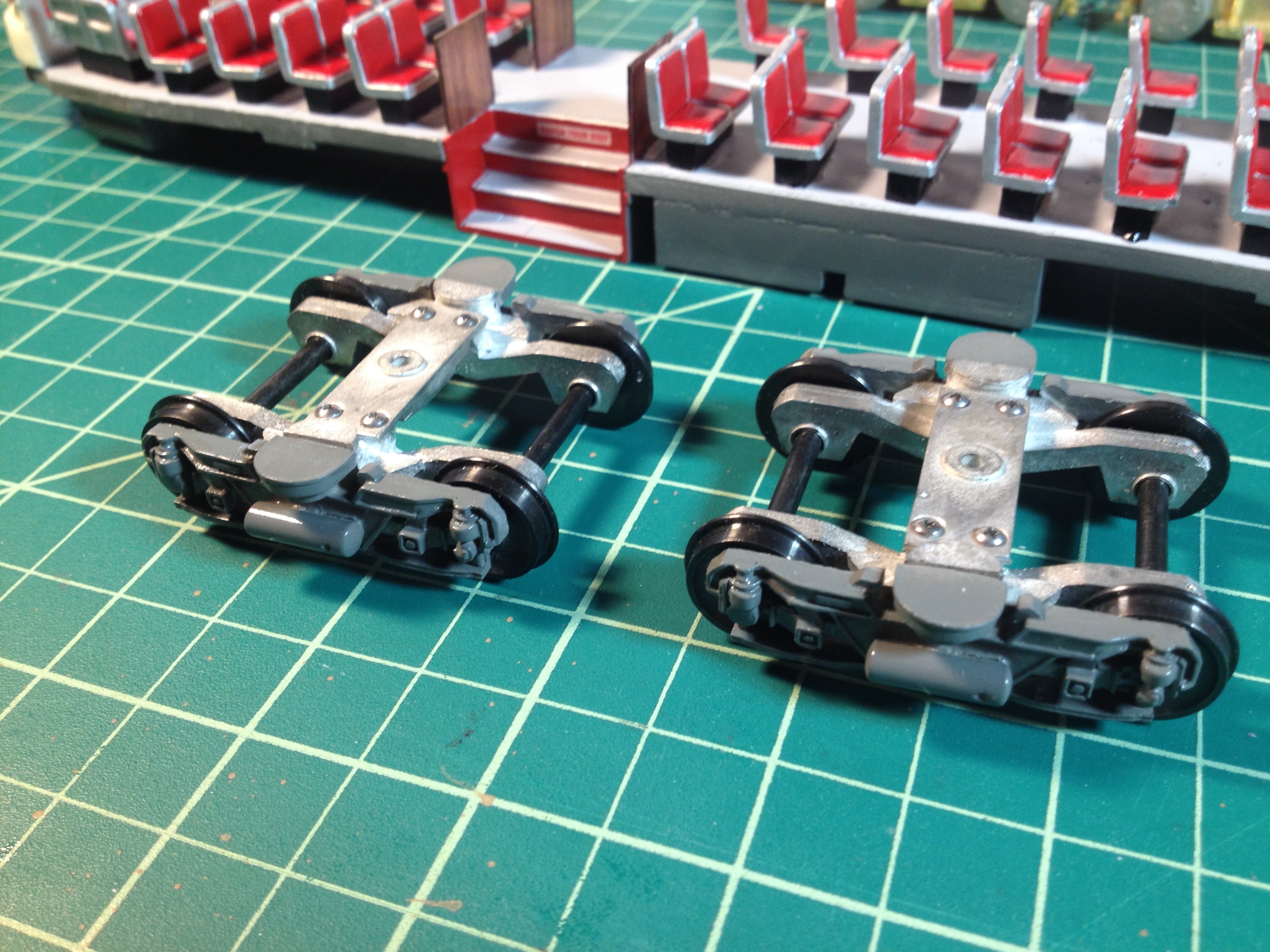 All parts will need to be primed. I painted all the interior parts and truck sideframes before intalling them. The seats required 3 colors: red, silver and black. I painted the red first, then silver trim ... multiple touch ups back and forth ... red, silver, red, silver - until they looked presentable. This took 3 days!